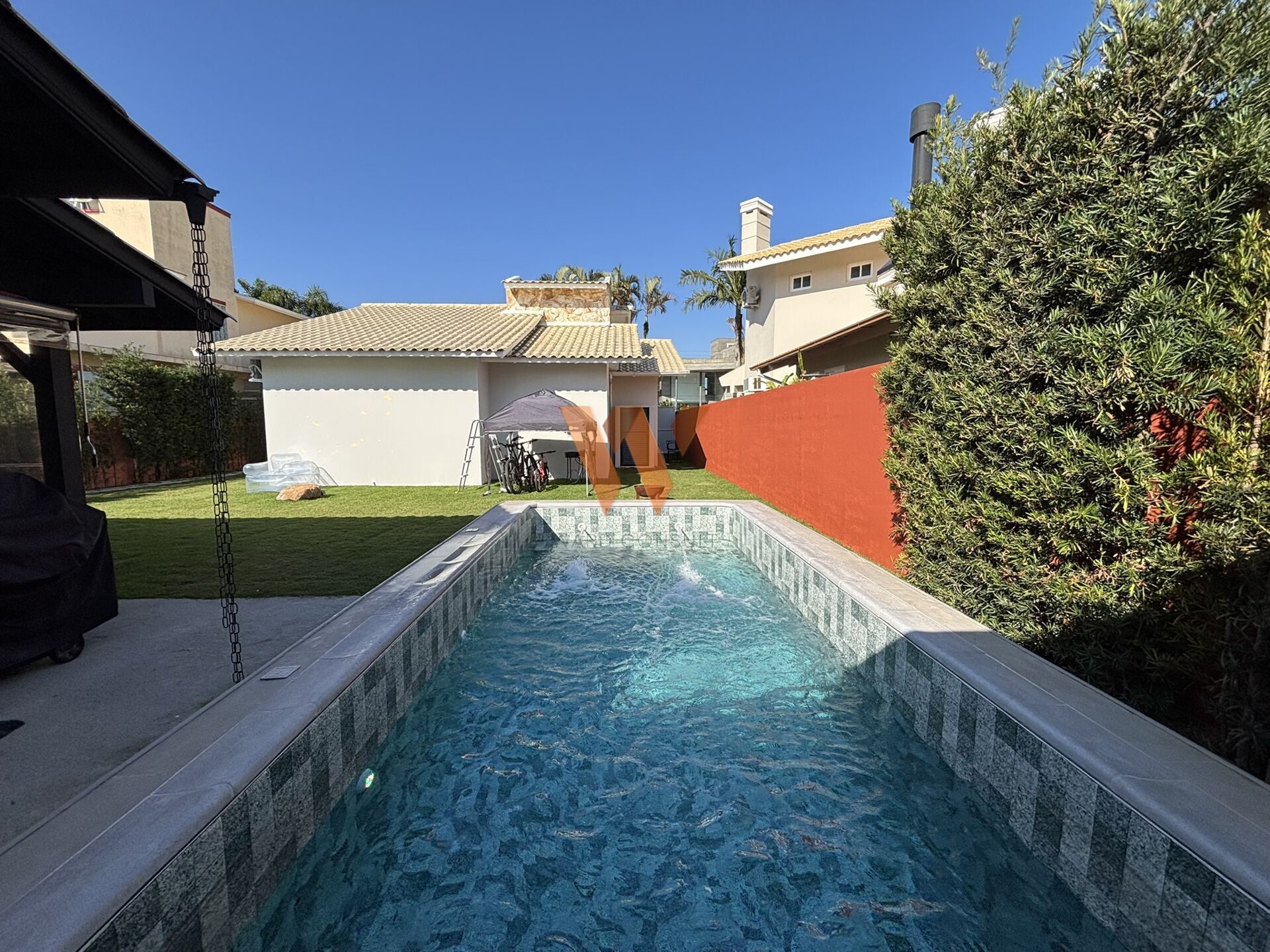 A área externa é um verdadeiro diferencial, contando com piscina aquecida com sistema de tratamento por sal, que alia conforto à praticidade. Nos fundos, encontra-se um completo espaço gourmet, ideal para momentos de lazer, equipado com churrasqueira a carvão, banheiro de apoio e um depósito.